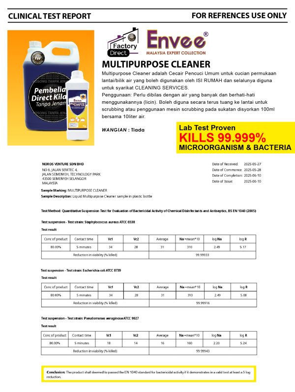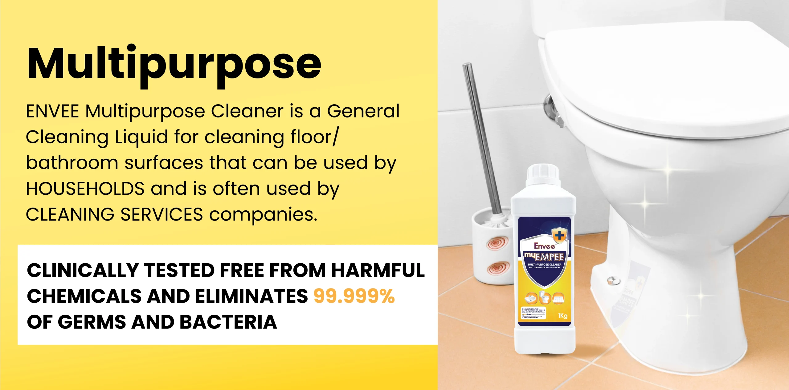ENVEE Multipurpose Cleaner is a General Cleaning Liquid for cleaning floor/bathroom surfaces that can be used by HOUSEHOLDS and is often used by CLEANING SERVICES companies.